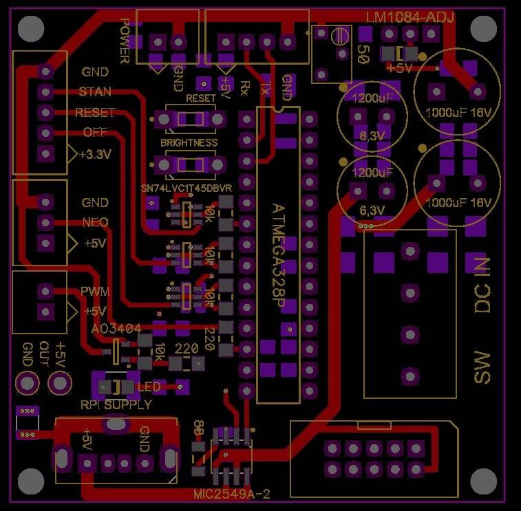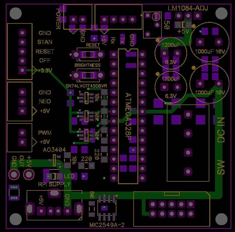 The principle is simple: pressing the on/off button is to turn on the power to the RPi, during startup is to turn on the backlighting of the buttons and volume knob and to make things more difficult, I proposed to control the LEDs with PWM waveform from 0 to 100%. Pressing the on/off button again will switch off the RPi but this is to be done according to a certain procedure. First, the power supply controller issues a 1sec signal to the GPIO of the RPi responsible for turning off the Volumio, On the next GPIO the Volumio activity signal is issued and its state changes when the system is shut down. The power supply observes this state and when it changes it adds a few more seconds and then shuts down the RPI power supply. Why does it work this way? Because the Raspberry is still calculating something for 5-6 seconds and switching it off at this point could cause a problem with the program. Of course the PWM control works in the opposite direction, i.e. from 100 to 0% and the leds are supposed to fade nicely.