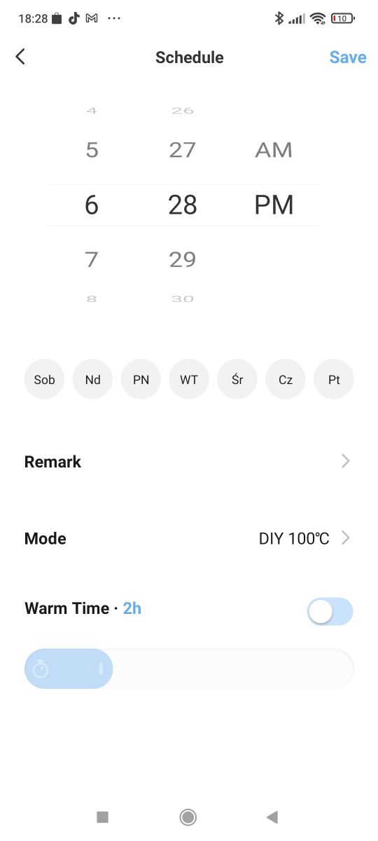 Automation can be set. For example, you want the kettle to boil water on a given day at a given time.