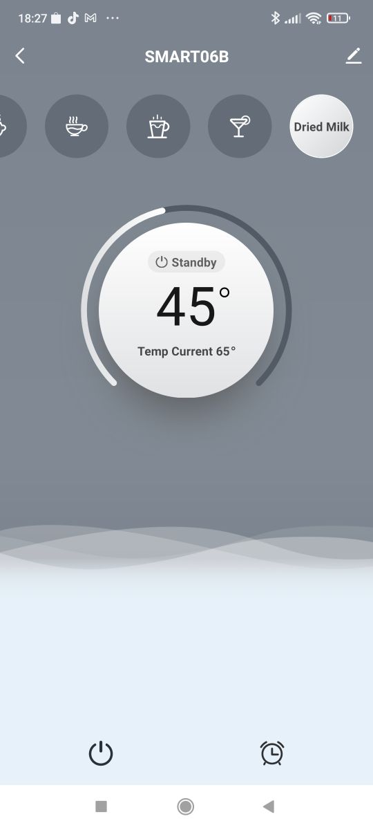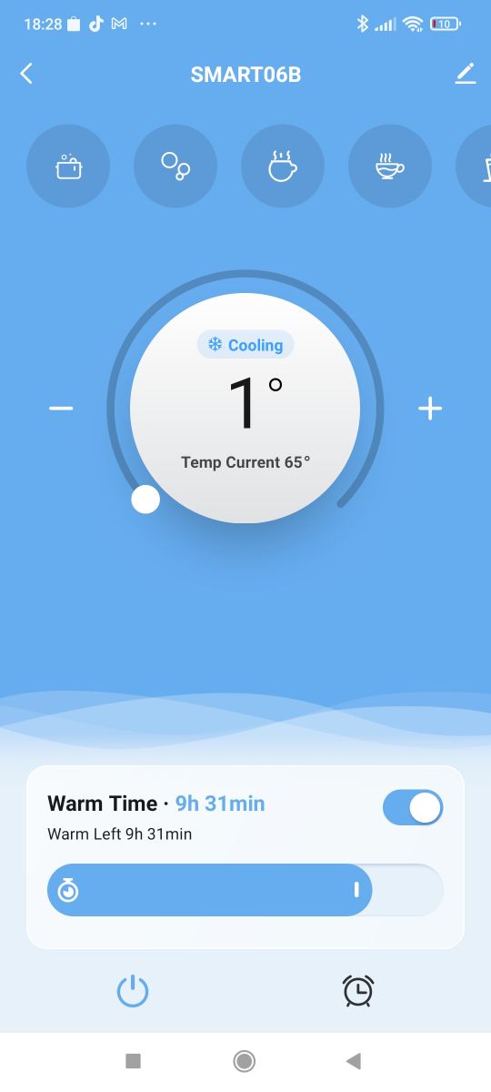 In the app, we are welcomed by a preview of the current temperature, operation control and operating modes. We can select one of the predefined temperatures or set our own.