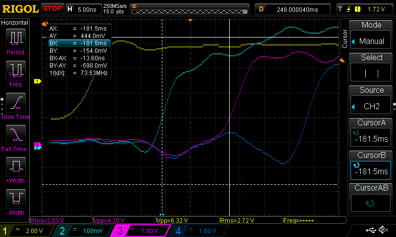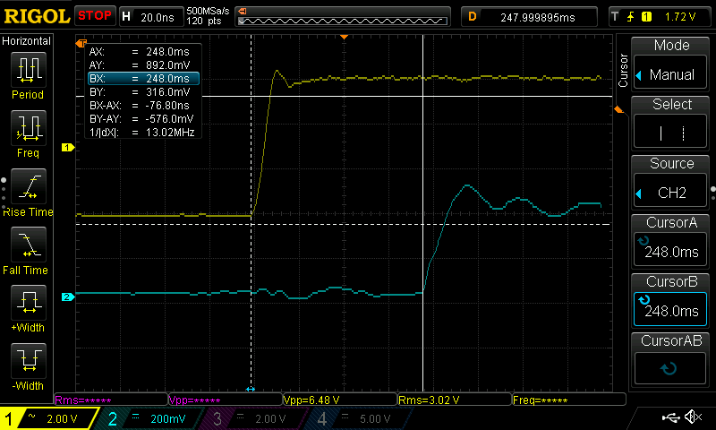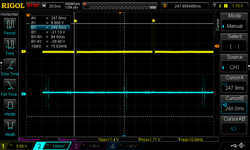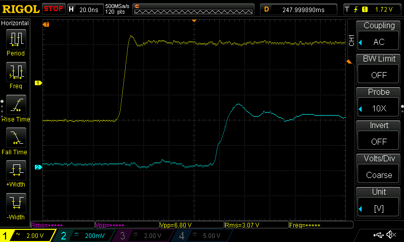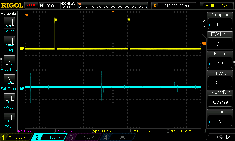 This is what the IN input signal (yellow trace) and the OUT output signal (blue trace) look like. The action of the delay line is visible.