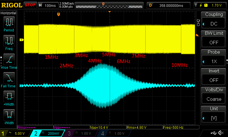 Estimating the frequency response with an oscilloscope and tunable generator , the result is quite predictable, the amplitude peaks between 4-5MHz. You can also see that the line loads the generator output, the amplitude of the input signal varies over a small range.