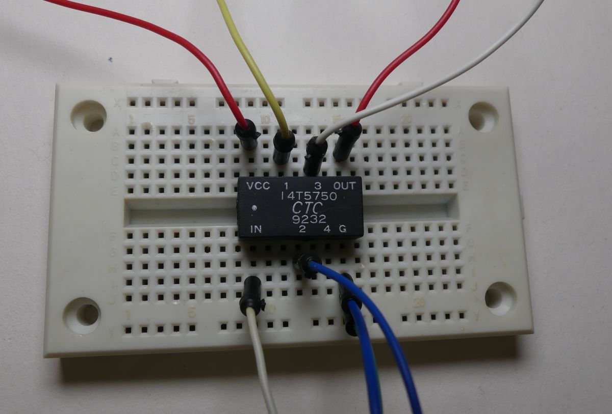 Let's see if the line still works. We supply the circuit with 5V -> current consumption about 17mA. We apply a 100KHz signal to the input and the current consumption increases to about 32mA. It appears that the embedded circuitry in the line is working.