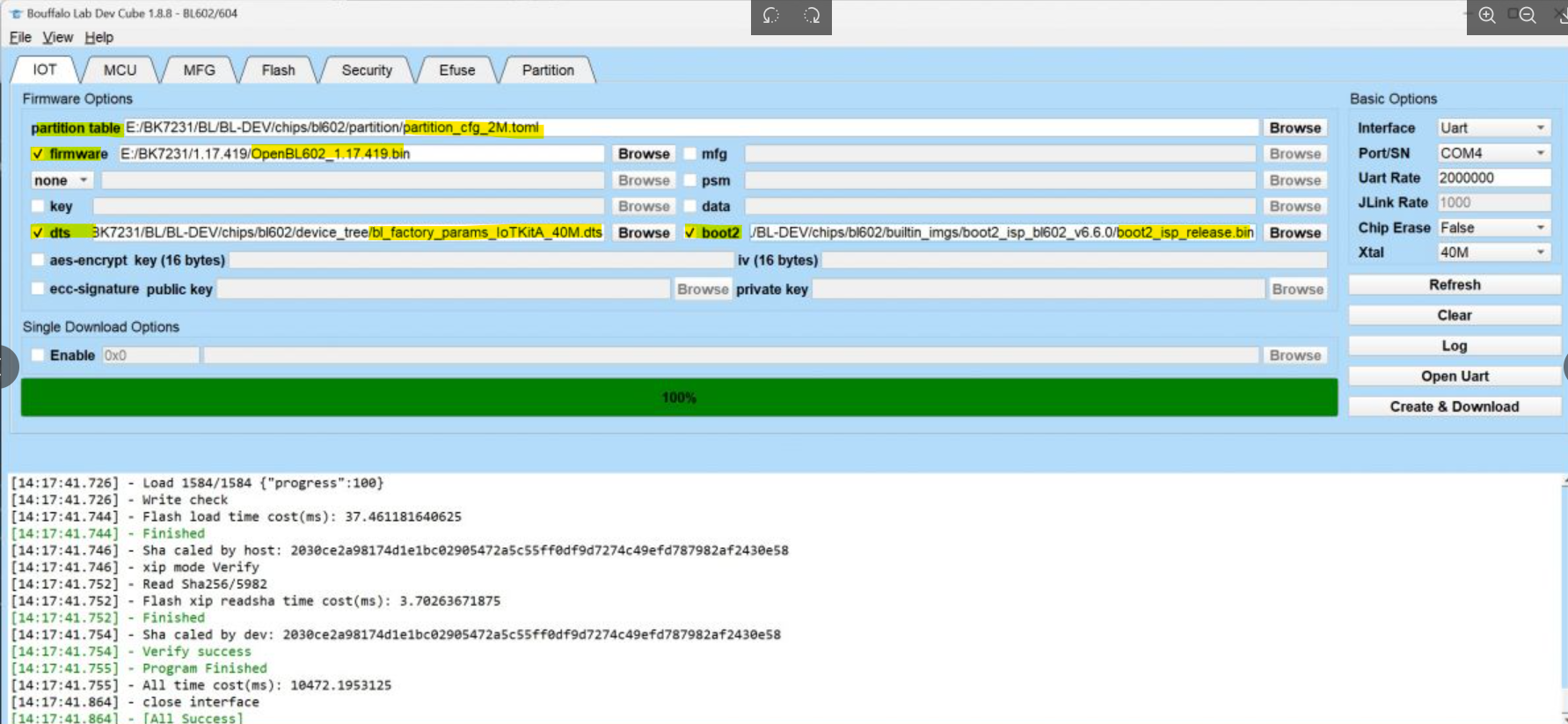 - Image selection and addressing - Use the OpenBeken “BL602 UART Flash” .bin from Releases. It’s prepared for the standard UART flashing flow; you don’t need to manually compose Boot2/partition/DTS. (github.com) - If you use BLDevCube’s advanced pages, ensure the partition config matches your flash size (most consumer BL602 devices are 2 MB; using an incorrect table can prevent boot). If you’re unsure, back up first. (elektroda.com)