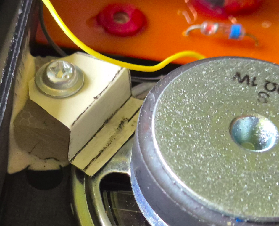 I didn't want to modify the original circuit, which is why there is no additional amplifier, remaining with a single TG50 powering either the speaker or the headphones. This is one of the simplest class A amplifiers, with a sizable DC component flowing through the driver. I used a 50 Ω high-ohm speaker and a 3.5mm stereo jack headphone socket. The headphones are connected in series, which causes them to act in counter-phase, so I reversed the polarity of one of them. While the speaker doesn't play very loudly the headphones are well driven. The power is high enough that I had to use a level control. This is a 4-position switch that switches the radio's power through 30 Ω and 100 Ω resistors.