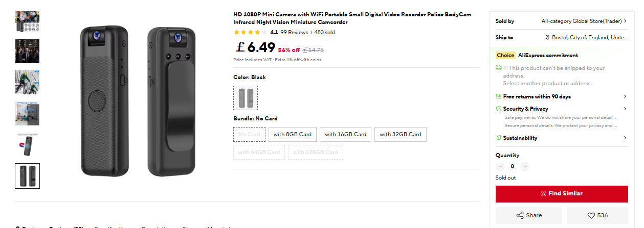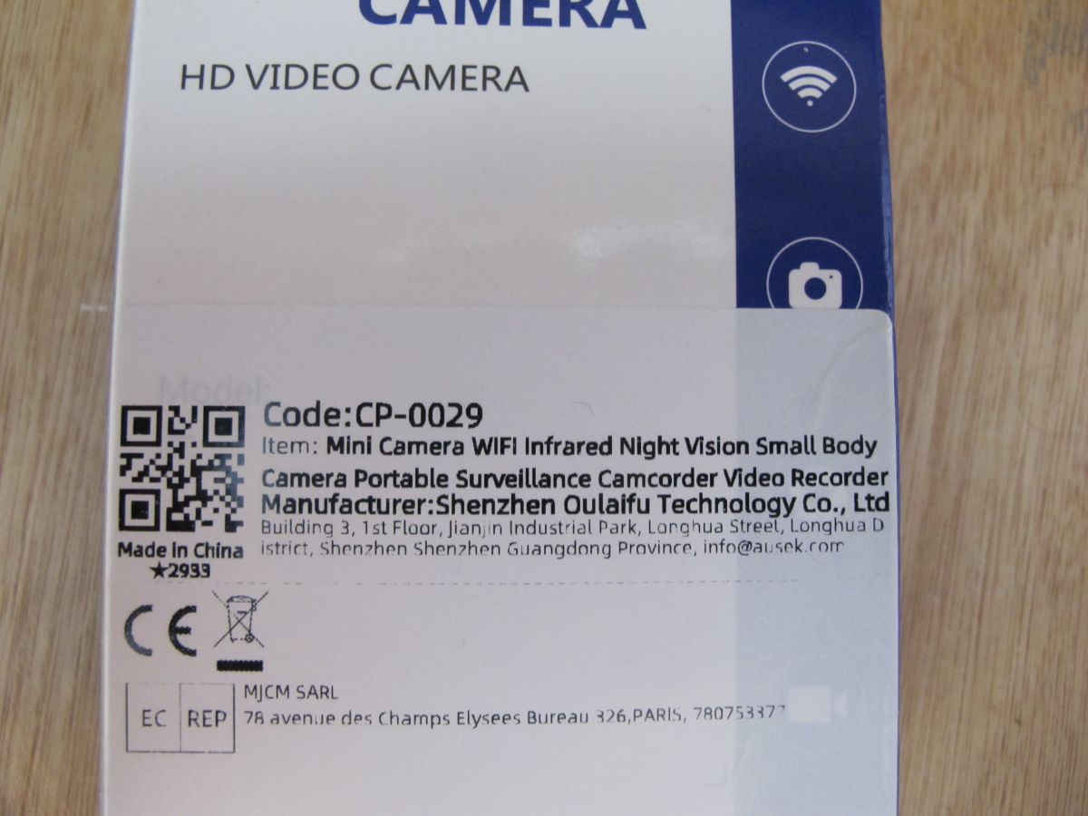 Another cheap mini cam from Ali Express to play with. This is marketed as a "HD 1080P Mini Camera with WiFi Portable Small Digital Video Recorder Police BodyCam Infrared Night Vision Miniature Camcorder"