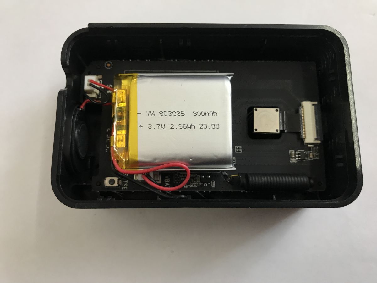 Now perhaps the most interesting part. Inside is a YW 803035 800 mAh 3.7 V 2.96 Wh battery and a single board. You can also see the antenna.
