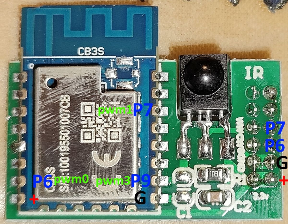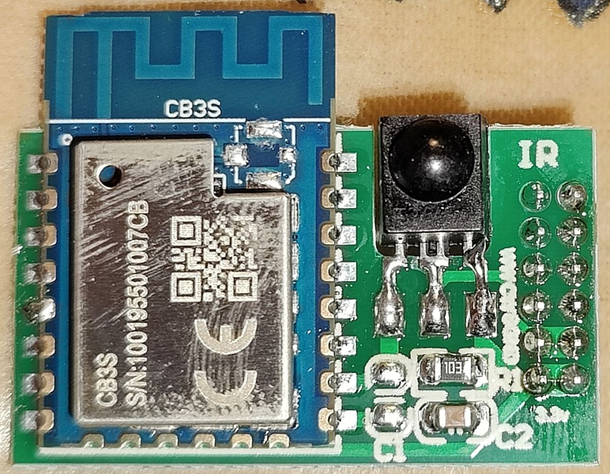 The chip is CB3S and is mounted on a circuit board that can be easily removed. There is also an IR receiver on the small circuit board.