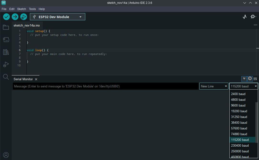 I have a problem with the Arduino IDE and the ESP32 ESP-WROOM-32U. In arduino IDE 2.3.6 and win11, I do not have the option to select the baud rate of the serial port ANI 9600 or 115200 from the expanded list. There are no such values in the list.