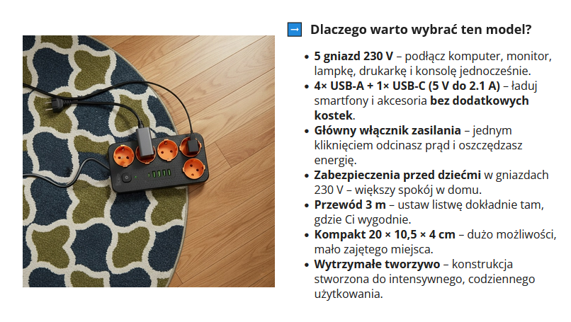 The packaging again states 5 volts and 2.1 amps. The product itself looks good, although here there are already Schuko sockets, not French. There is also no overcurrent circuit breaker.
