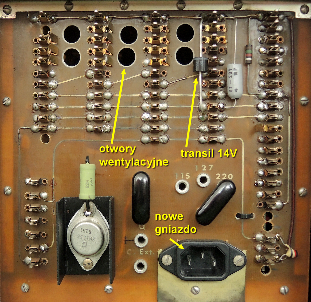 I was already able to fit the transformer and power supply board. The power supply still needed to replace the 2N555 germanium transistor that stabilises the -12V voltage. I replaced it with a much stronger 2N1558 transistor and added a new resistor (the original one was burnt out).