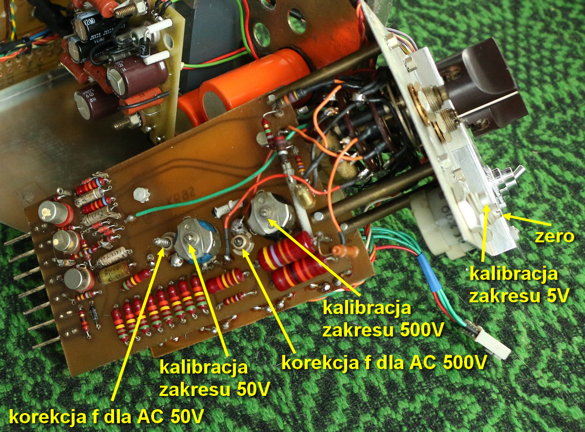 After replacing the reed switch and cleaning the switches, the voltmeter started up on all ranges, but the readings were not correct. On the underside of the unit there is a voltage reference - a 6.2V reference diode (small black element) and resistors, including two precision resistors. A couple of resistors were faulty, fortunately the precision 1200 Ω and 4 kΩ resistors are OK. I replaced the resistors with Polish RMGs. I still had to glue the calibration voltage setting potentiometer visible in the photo, because the lid fell off.