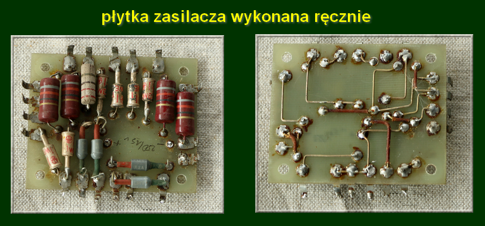 I started the repair by removing the power supply board and electrolytic capacitors. Some of the components on the board seen in the photo above were damaged, so I did not dismantle them and left the whole board as an antique. For the device I made a new board according to the original schematic, 1960s technology.