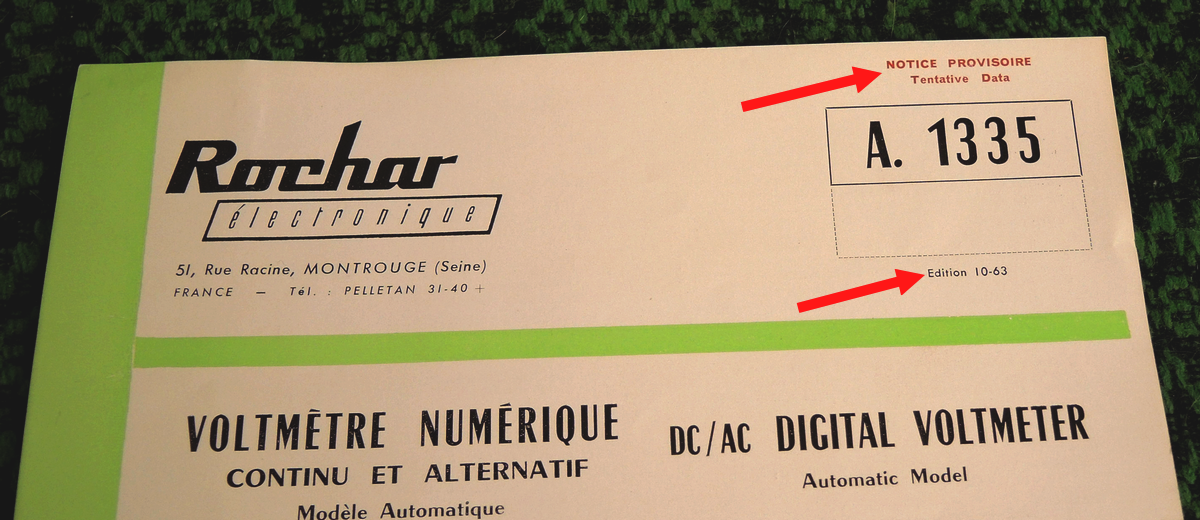 The A.1335 series-produced voltmeter appeared in the official Rochar catalogue in 1964. It was one of the first digital voltmeters designed in Europe. A working prototype version was made by Roger Charbonnier in 1962. Charbonnier had it in his office until the end of his work at Adret Electronique. It is a beautiful antique, well worth repairing and restoring!