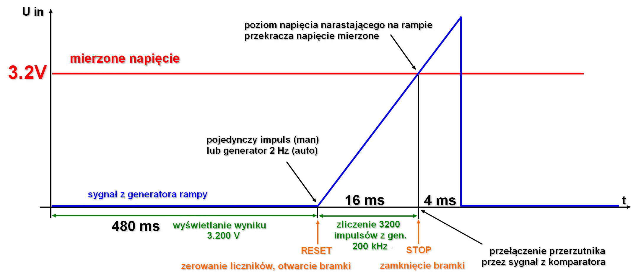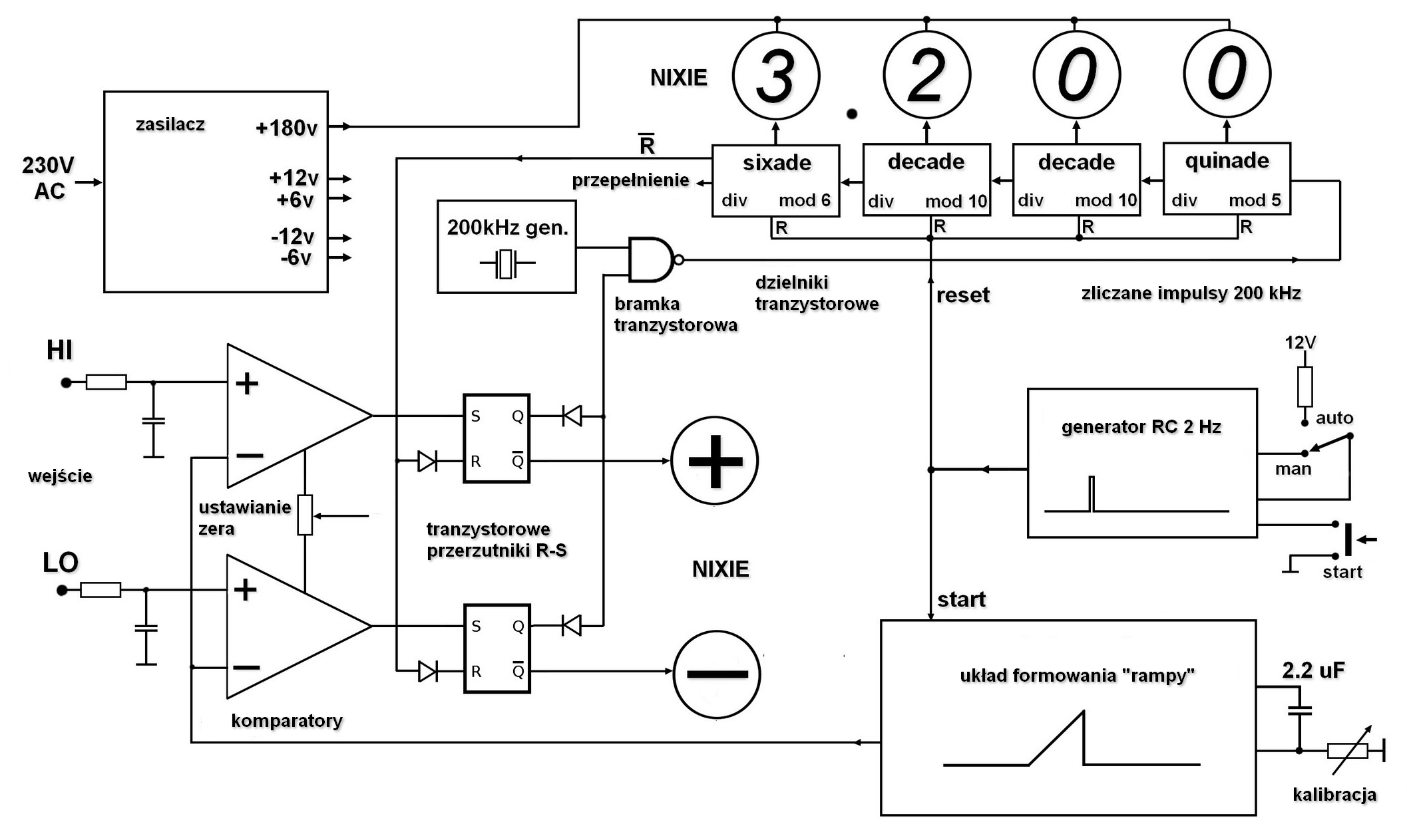 The measuring system can be triggered manually with a push button (one measurement) or automatically from a 2 Hz generator. Immediately after triggering, the counters are reset and the flip-flop opens the gate and pulses from the 200 kHz quartz generator are applied to the counters, which count them by flashing for a while (no latch). At the same time, the 'ramp' formation circuit is activated, which feeds a linearly rising voltage to the comparator depending on the time constant of the RC circuit with a 2.2 uF capacitor. When the "ramp" voltage exceeds the measured voltage, the comparator switches the flip-flop, which closes the gate and the displays show the measured result. Another cycle can be started by pressing a button, or the automaton will repeat the measurement every half second. Seemingly simple, but building this without digital integrated circuits, on old germanium transistors is a masterpiece.