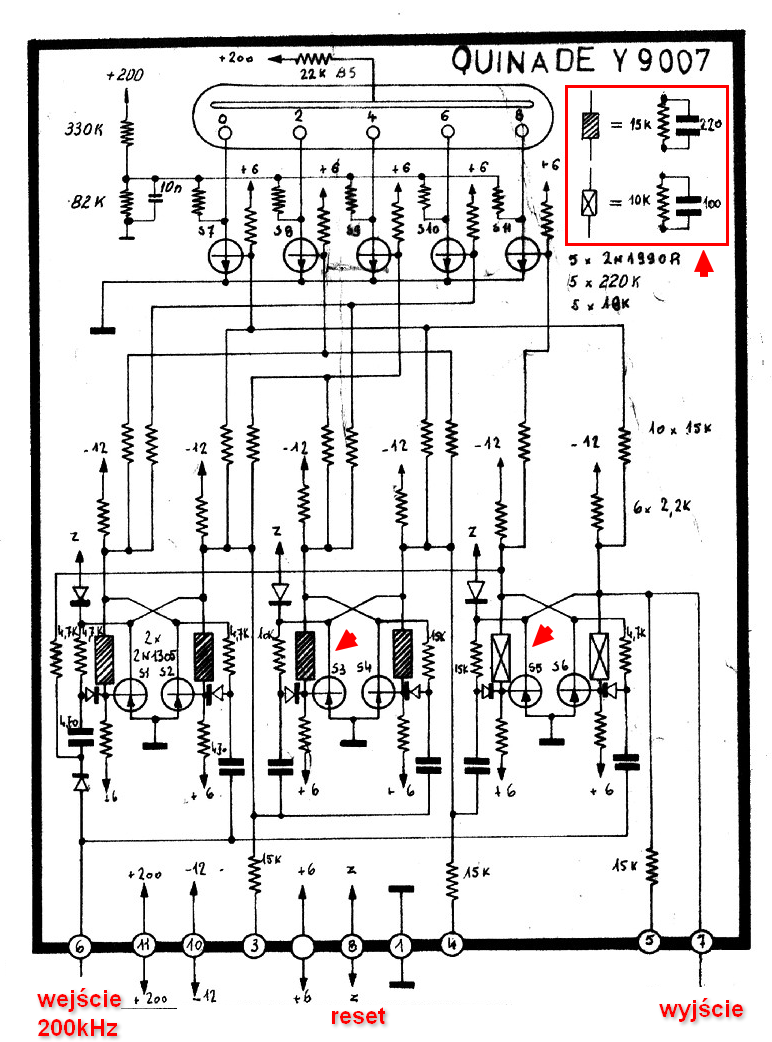 The 200 kHz quartz generator works, the gate opens, but the first quinada does not count correctly! (quinada is a word invented by Charbonnier, he liked to create his own words to name his circuits, sometimes he also created his own symbols). Let's look at the schematic of this divider: Three flip-flops configured to divide by 5 and a simple driver on 5 transistors.
