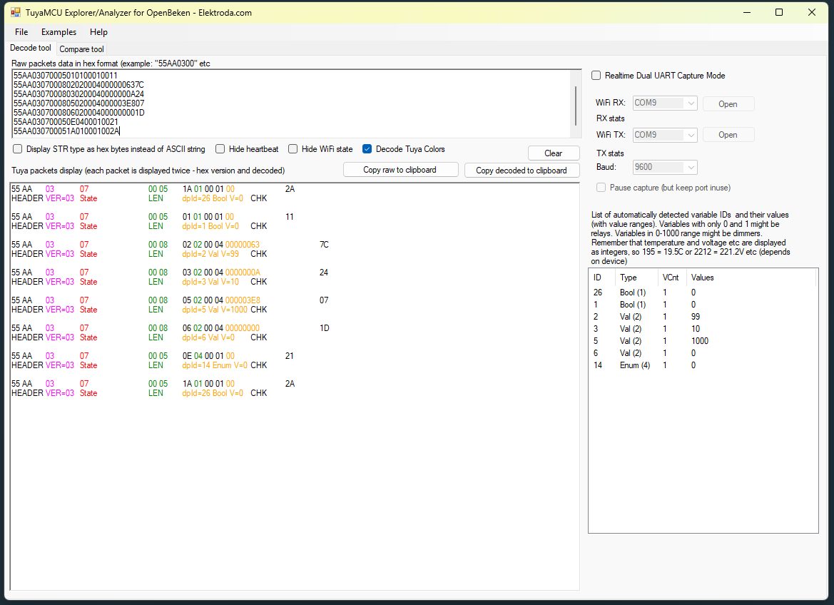 The protocol is structured so a variable length of hex values is sent and then some are received. The ones that are received contain the status. The sending ones are telling the electronics what to do (Control). All message start with 55 this gives a nice square wave for each side to sync with. Then AA...