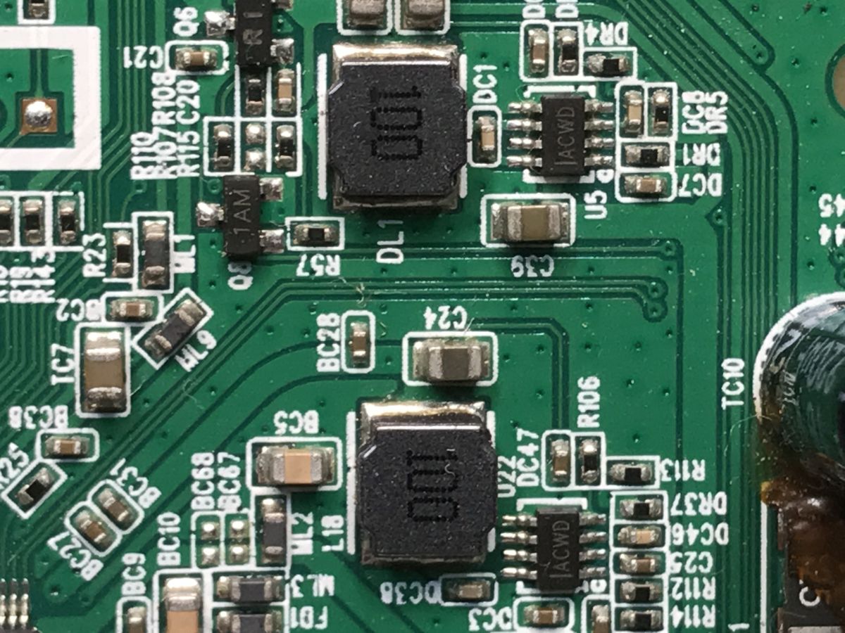 The board consists of two sections - the 'hot', primary side of the power supply, and the 'cold', low-voltage side. Most of the components are surface mounted.