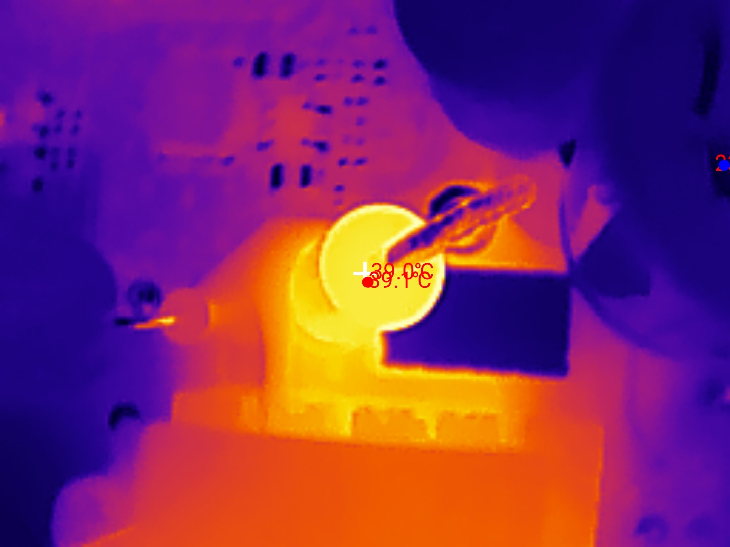 The CPU and the inverter heat up the most - separately its primary and secondary sides. On the primary side, the TNY and the current measurement resistor heat up: