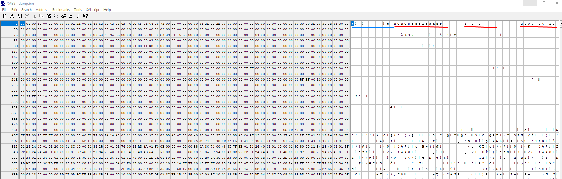 I quickly decided that I would play around manually. Right at the start you see something that resembles a header structure - you can see the inscriptions NCRCbootloader, 1.0.0 and some date.
