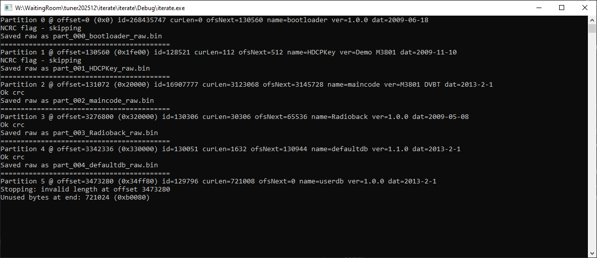 Partition 2 @ offset=131072 (0x20000) id=16907777 unk=2091331328 len=3145728 name=maincode ver=M3801 DVBT dat=2013-2-1