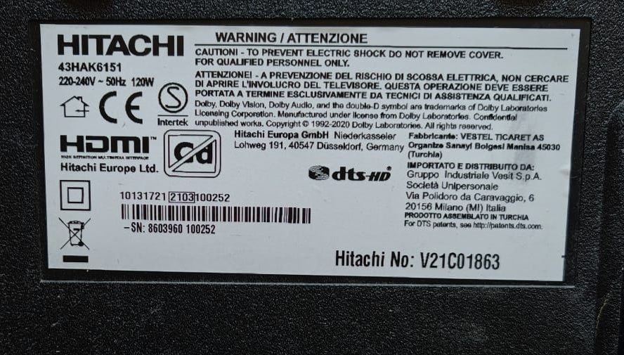 The TV is a HITACHI 43HAK6151. The board is a Vestel 17MB170, and the panel is VES430QNDH-N2-N46. Thanks to anyone who can help me.