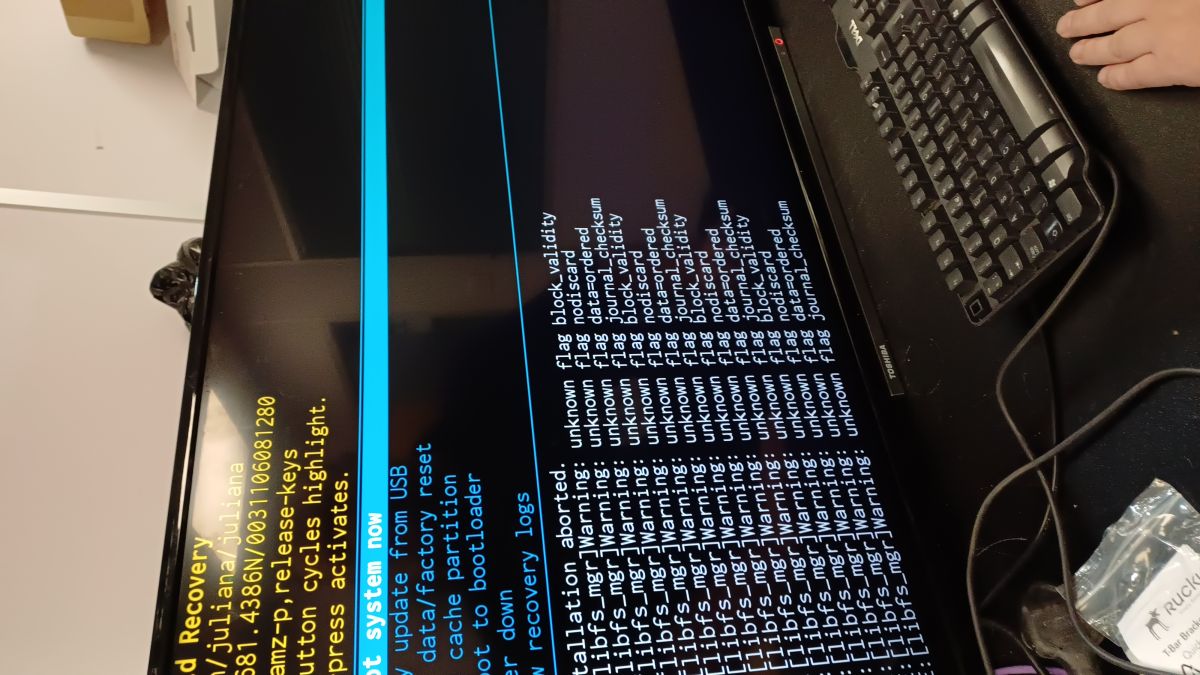 The TV is stuck in a boot loop with FireTV logo. I can enter bootloader OK but many errors in the logs relating to e:libfs_mgr Warning: unknown flag ...