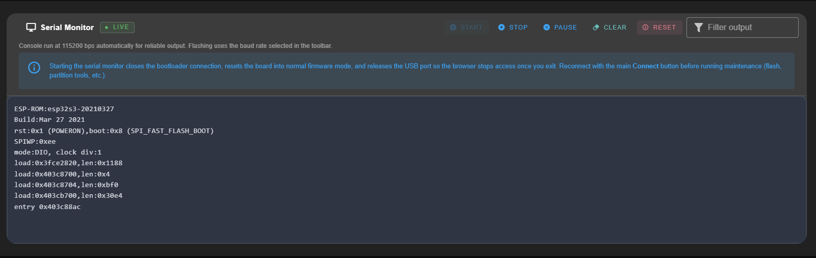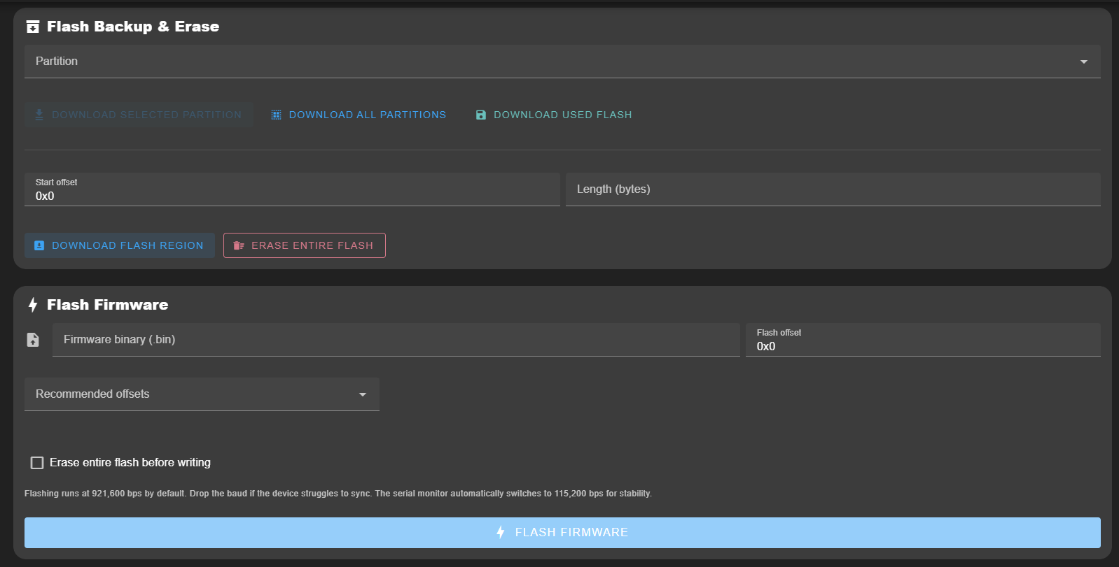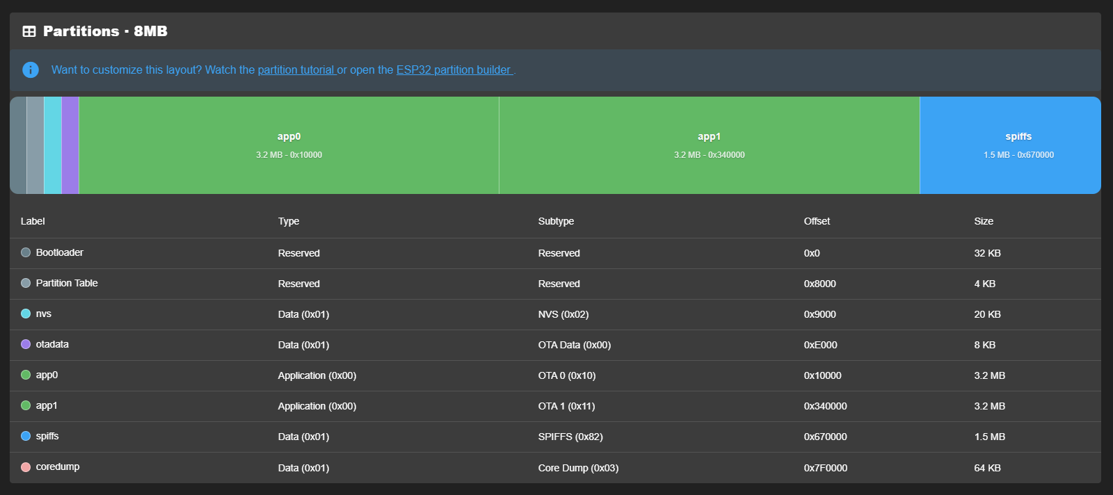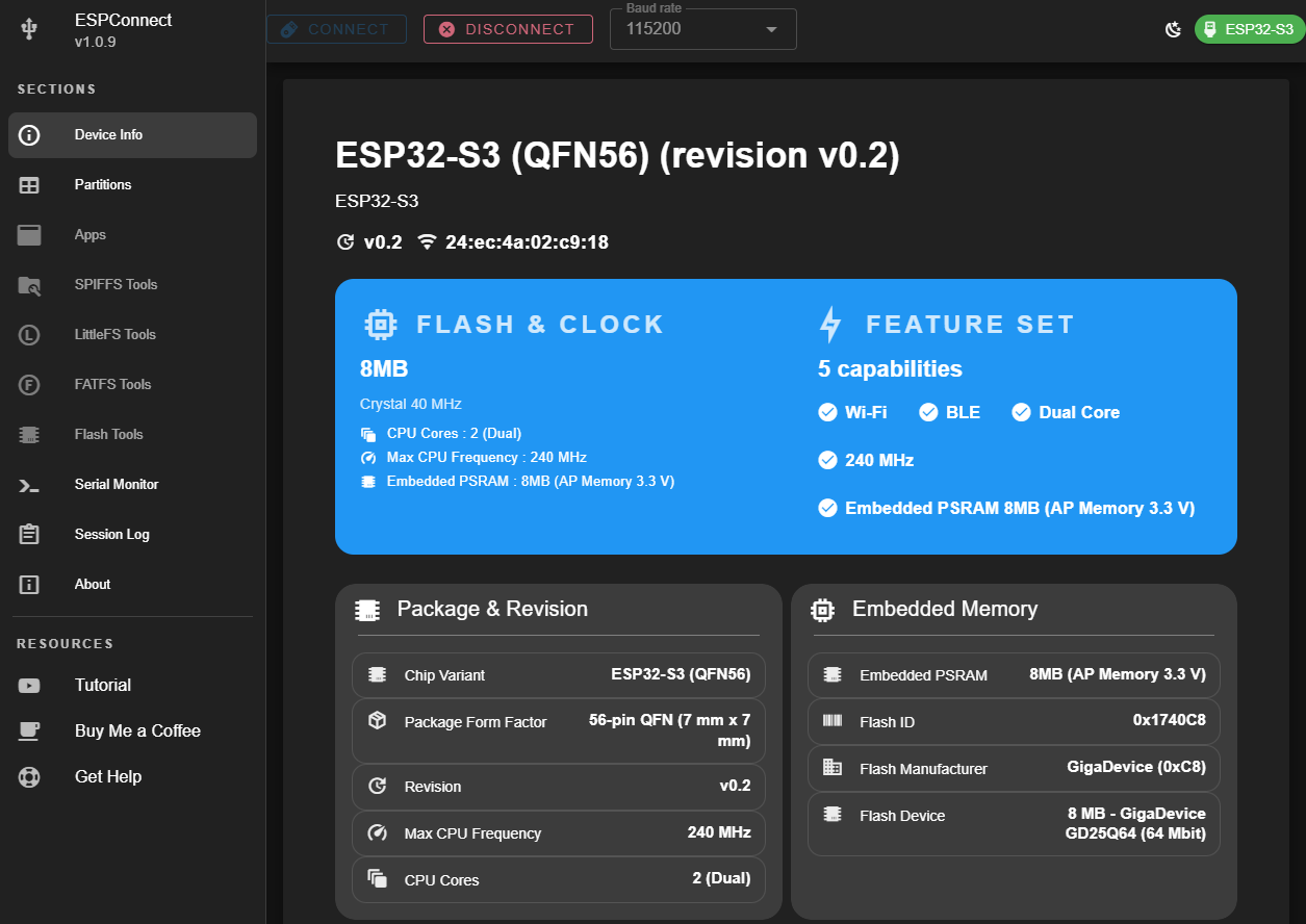 ESPConnect is an advanced tool for managing ESP family microcontrollers without having to install desktop applications. It allows you to read and upload the contents of the chip's Flash memory. It allows you to view detailed device information such as chip family, MAC, flash size and timing. It also has an extensive file system manager (SPIFFS, LittleFS and FATFS) with file viewing, writing and reading. ESPConnect offers a graphical representation of the layout of flash partitions and tools to back them up or restore them.