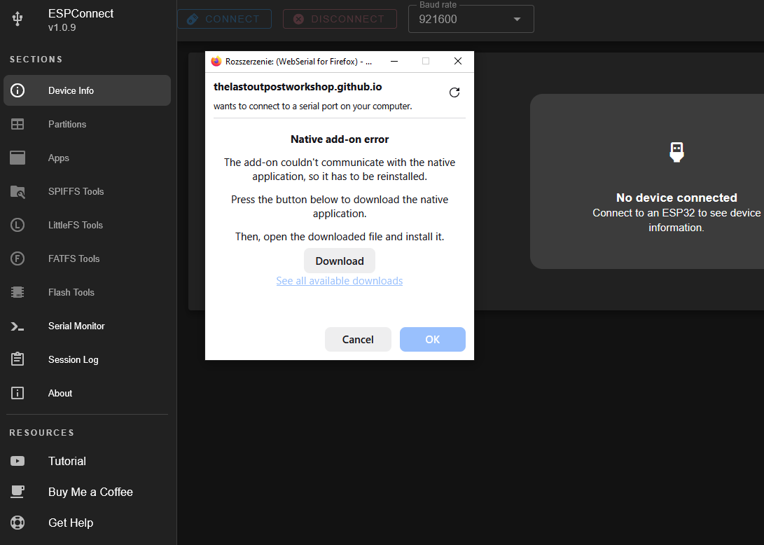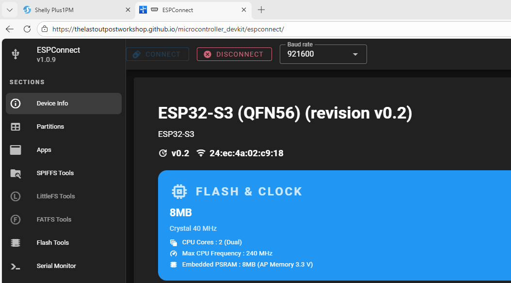 ESPConnect is an advanced tool for managing ESP family microcontrollers without having to install desktop applications. It allows you to read and upload the contents of the chip's Flash memory. It allows you to view detailed device information such as chip family, MAC, Flash size and clocking. It also has an extensive file system manager (SPIFFS, LittleFS and FATFS) with file viewing, writing and reading. ESPConnect offers a graphical representation of the Flash partition layout and tools for backing up or restoring them.