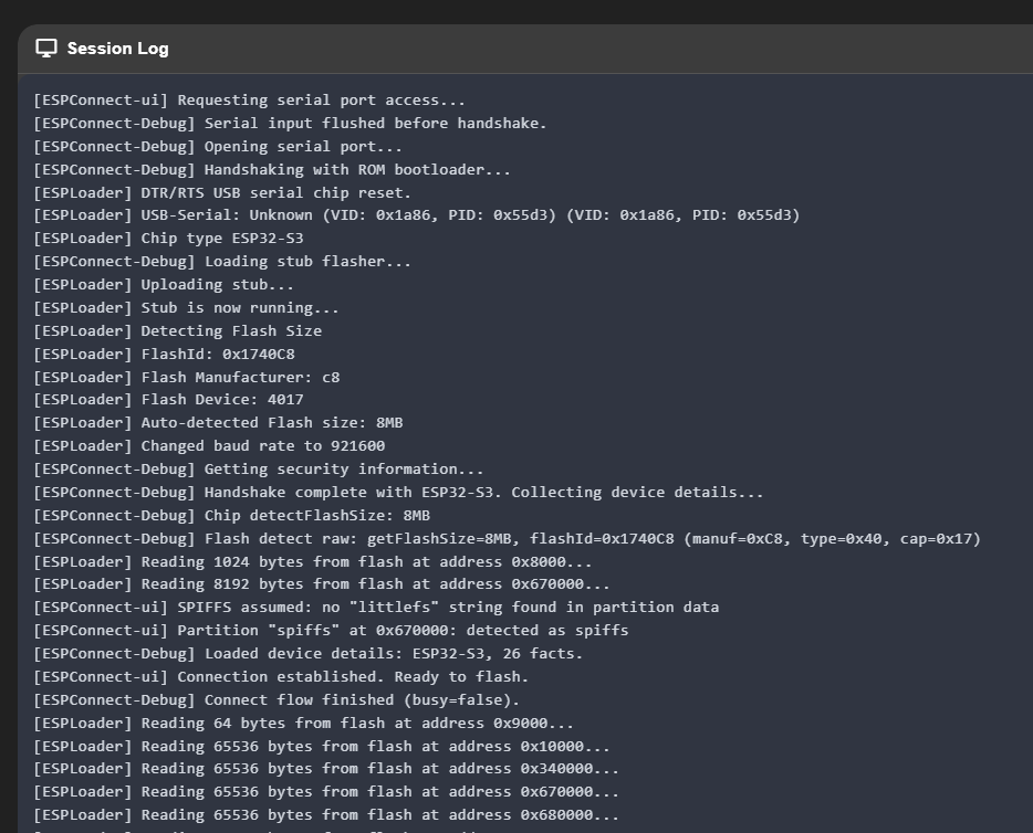 The Session Log, on the other hand, tells us what the ESPConnect was doing - you can view there what was read, what went wrong, etc: