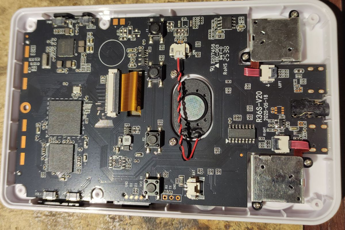 The construction of the device is based on a single, at least two-layer PCB. Most components are surface mounted. At the heart of the console is a Rockchip RK3326 processor along with H9TQ32A4GTMC-URKUM memory.