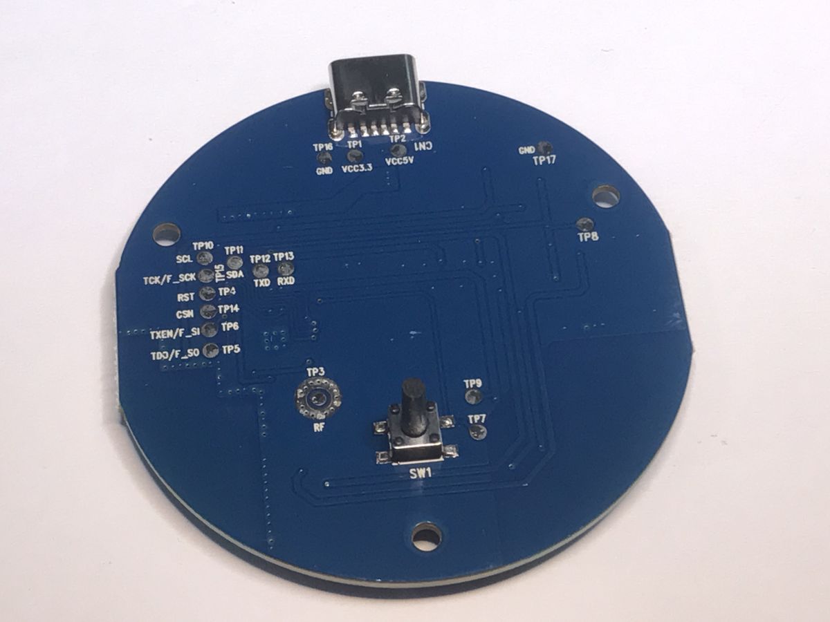 On the bottom of the PCB there are pads for programming. The signals from UART and SPI can be distinguished here.