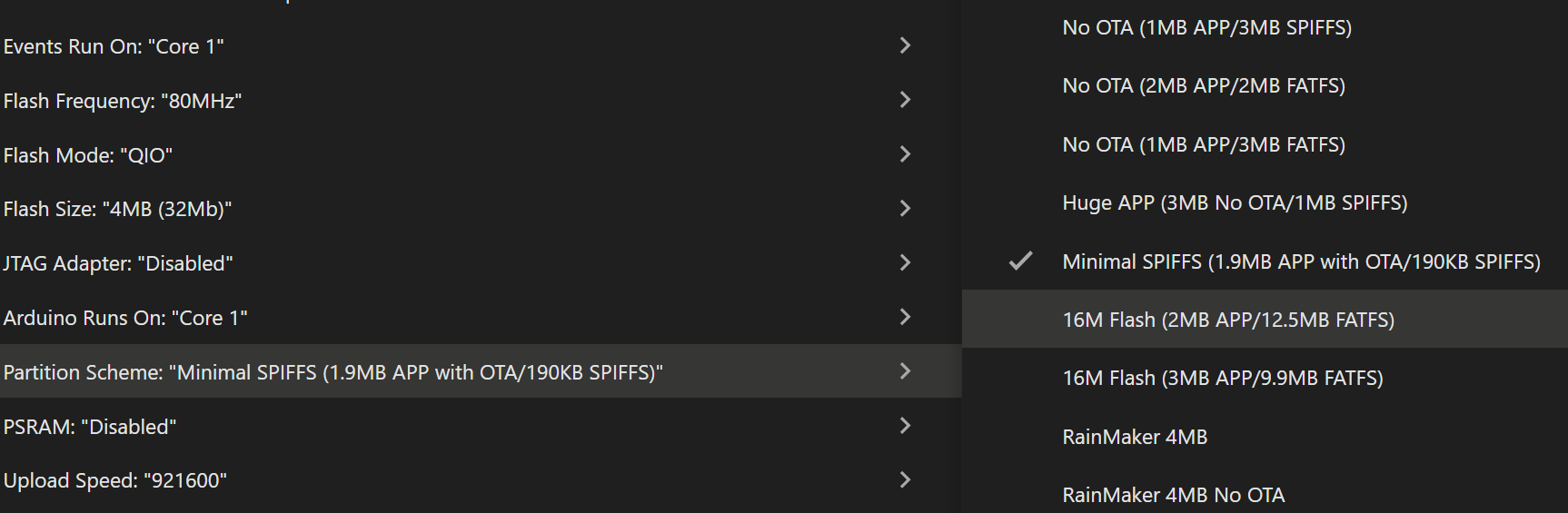Minimal SPIFFS ( 1.9Mb APP WITH OTA/190Kb SPIFFS ) and I don't have this option . It is 1.9Mb but with 128Kb . And here I do not know what to do ?
