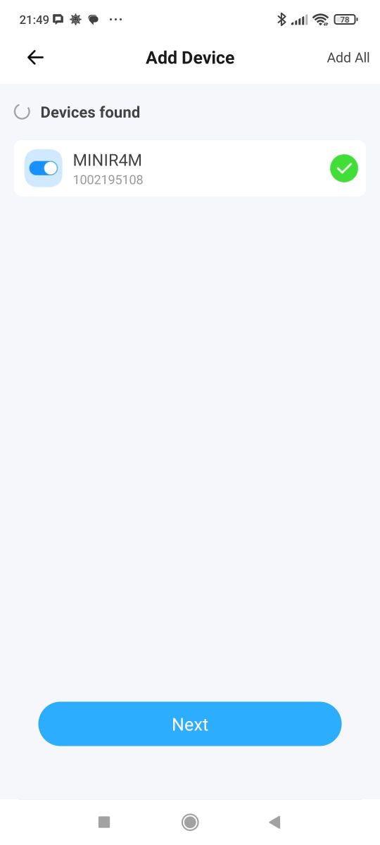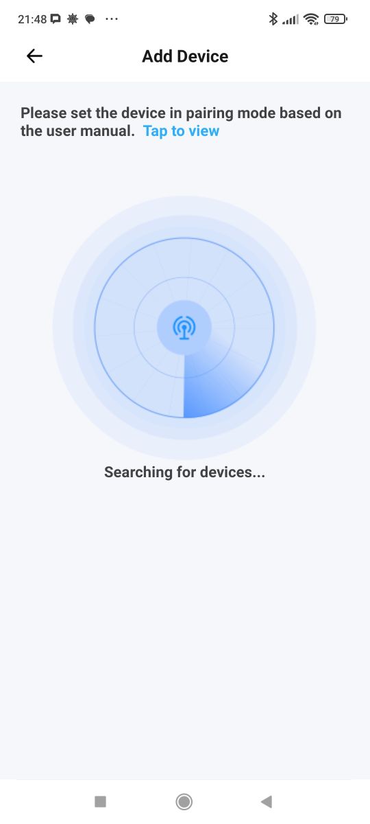 We download the app and create an account. The product works with a 2.4 GHz Wi-Fi network. We put it into pairing mode. The phone finds the device: