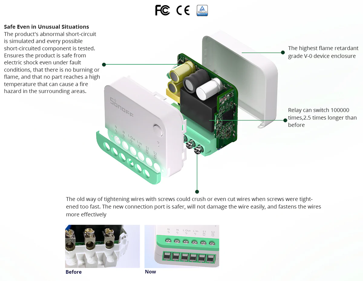 The Sonoff MINIR4M is a small, in-box relay that allows you to easily turn a simple lighting or electrical device into a Wi-Fi-controlled building automation component. With Matter support, it can work with different ecosystems (Apple Home, Google Home, Alexa) without being locked into a single app.