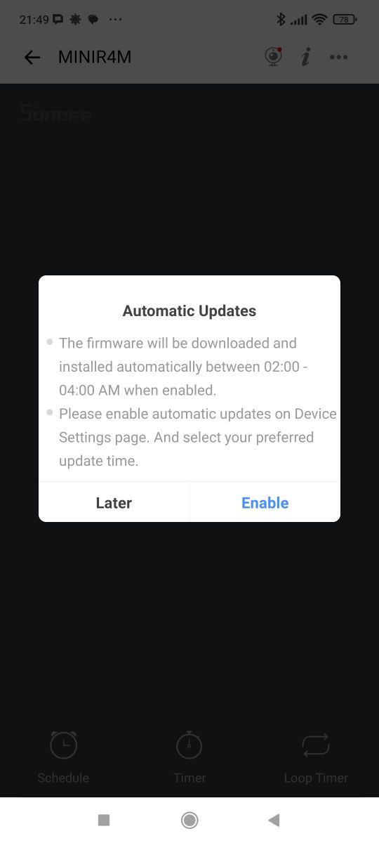 This way we get remote control of the device from within the app. The app also asks us for updates, which it proposes to do at night between 2:00 and 4:00.