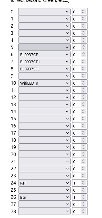 From the extracted config: BL0937 SEL→P8, VI/CF1→P7, ELE/CF→P6; Wi‑Fi LED→P10; Button CH1→P26; Relay CH1→P24. [Elektroda, tadeu1, post #21807160]