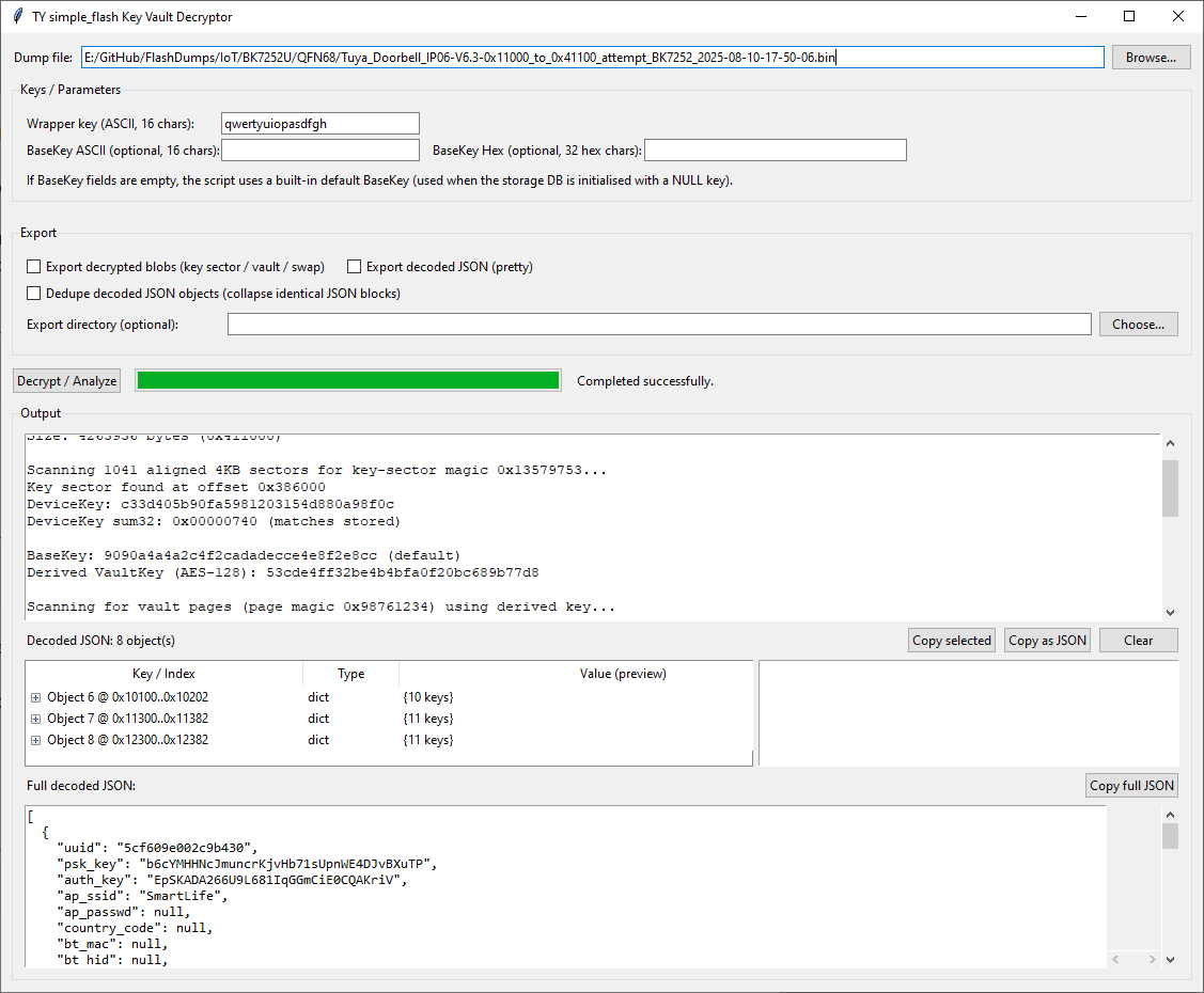 This uses the above mechanism to decrypt vault-style KV on dumps that are structured this way. I've added options to dedupe/collapse duplicate decoded objects (the vaults appear to contain duplicates / redundancy), export decoded JSON, export decrypted blobs (“swap” relates to a secondary region present in LN8825B dumps).