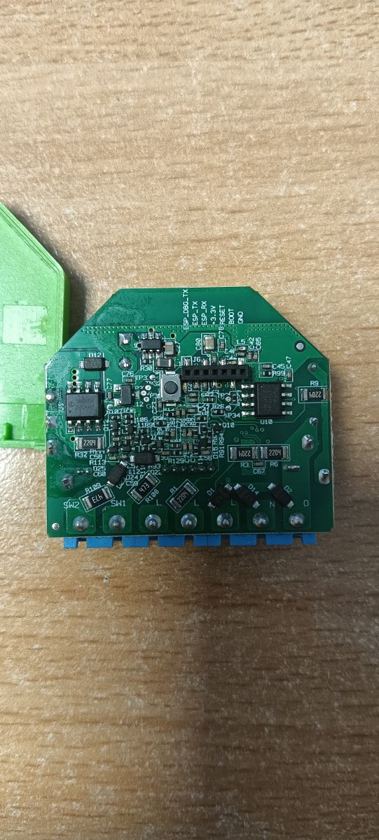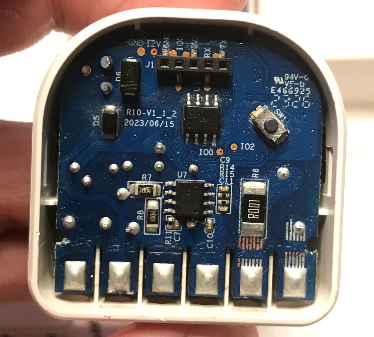 PCB designation: R10-V1_1_2 2023/06/15 This is a fairly new design for a chip with ESP8266. You can also immediately see the programming connector. Next to it is a BoyMicro flash bone with firmware and a BL0937 for energy measurement.