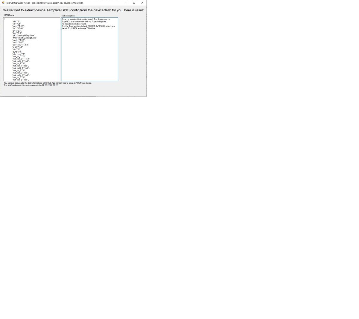 I eventually was able to get some signs of life for two of the units by overwriting the bootloader, writing OBK settings for the WiFi network and then finding it on DHCP. The relay responds in the web GUI. The RF section, according to the web app, is all FF FF. The MAC addresses of those two switches were identical. Using the web app, OTA flash seems to work using the overwritten bootloader. GUI MAC change does not; AP access point does not work. "Restore the RF part" from the UART flasher writes a few lines before the rest which, for the most part, are all FF FF FF according to the web app, but the GUI now shows a new random MAC which then appears on the network properly. Didn't get to test MQTT.