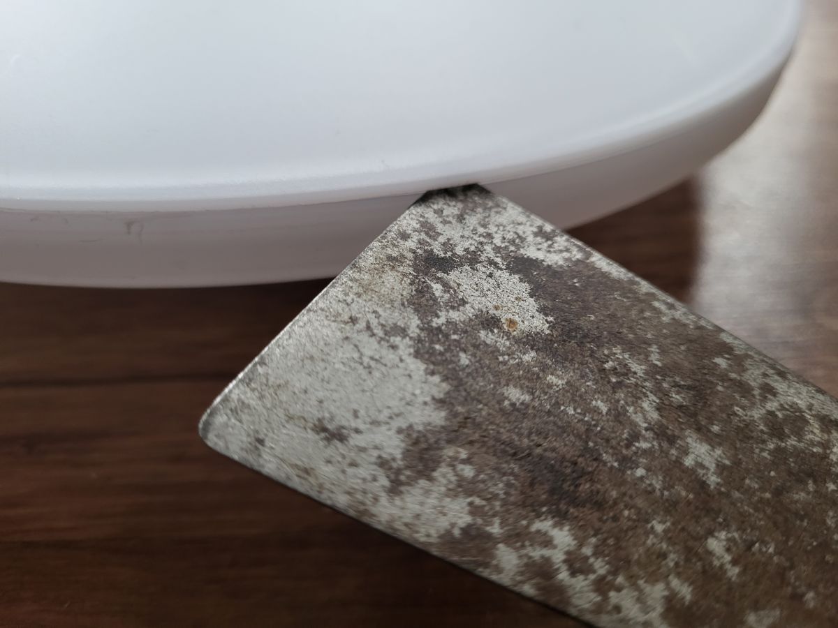 First we need to open the Lamp. The easiest way to get access is by going through the front. You can insert a scraper in this little nodge here. The cover is glued in... the easiest way without destroying anything is to twist the scraper to both sides. reposition the scraper on a different position and repeat the twisting motion until you can open the lid. be patient and you will only destroy the glue.