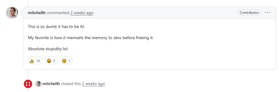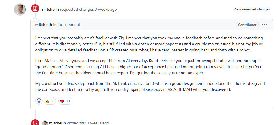 This is well illustrated by Mitchell Hashimoto's statement on X (formerly Twitter), who speaks directly about the drastic decline in the quality of PRs.