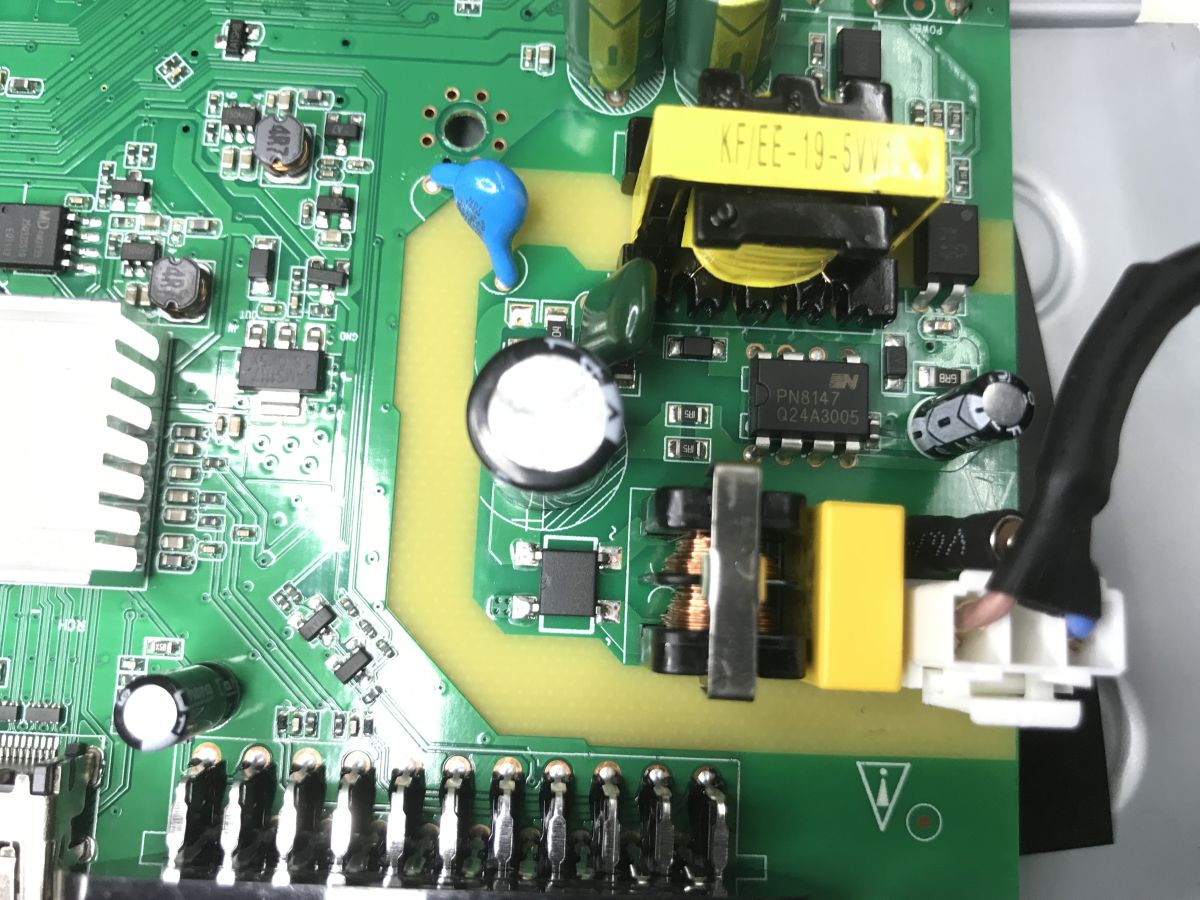 It probably generates 5 V - as usual. Then there is a section with a 1.8 V LDO and a voltage reduction inverter (5 V -> 3.3 V). The flash bone with firmware (25Q32CSIG) is also caught in the photo.