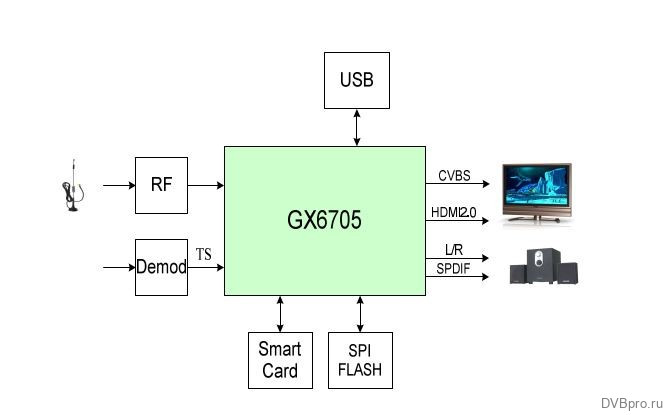 The NationalChip GX6706S5, is quite a popular chip in this type of device, vendors are not hiding about it. You can find a lot of decoders on this chip, although information about the chip itself is residual. It seems to belong to the larger GX/Nationalchip family of chips, along with: