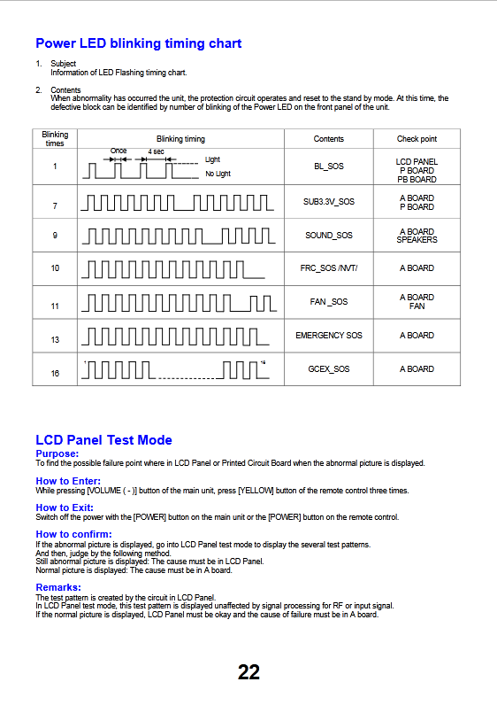 When I turn on the TV, the green diode lights up; no picture. After a few minutes it turns off — turns on. Again the green diode for a few minutes. Then red 13 times.