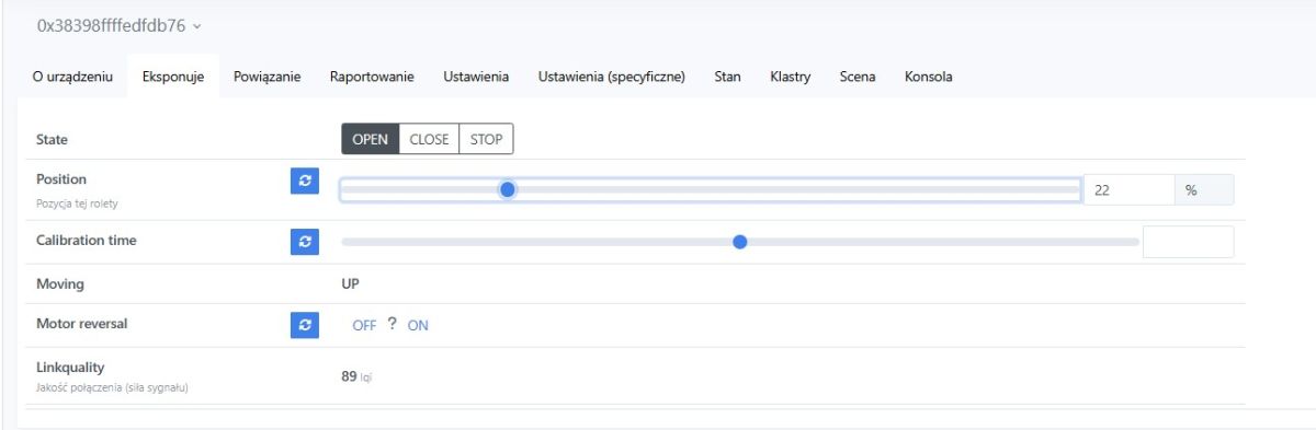 The device offers full control over the roller shutter. We have the possibility to perform predefined operations of opening, closing and stopping, and we can set its any position with the slider. In addition, we also read out its status and can reverse the direction of the motor, so that the wires do not have to be swapped places if necessary.