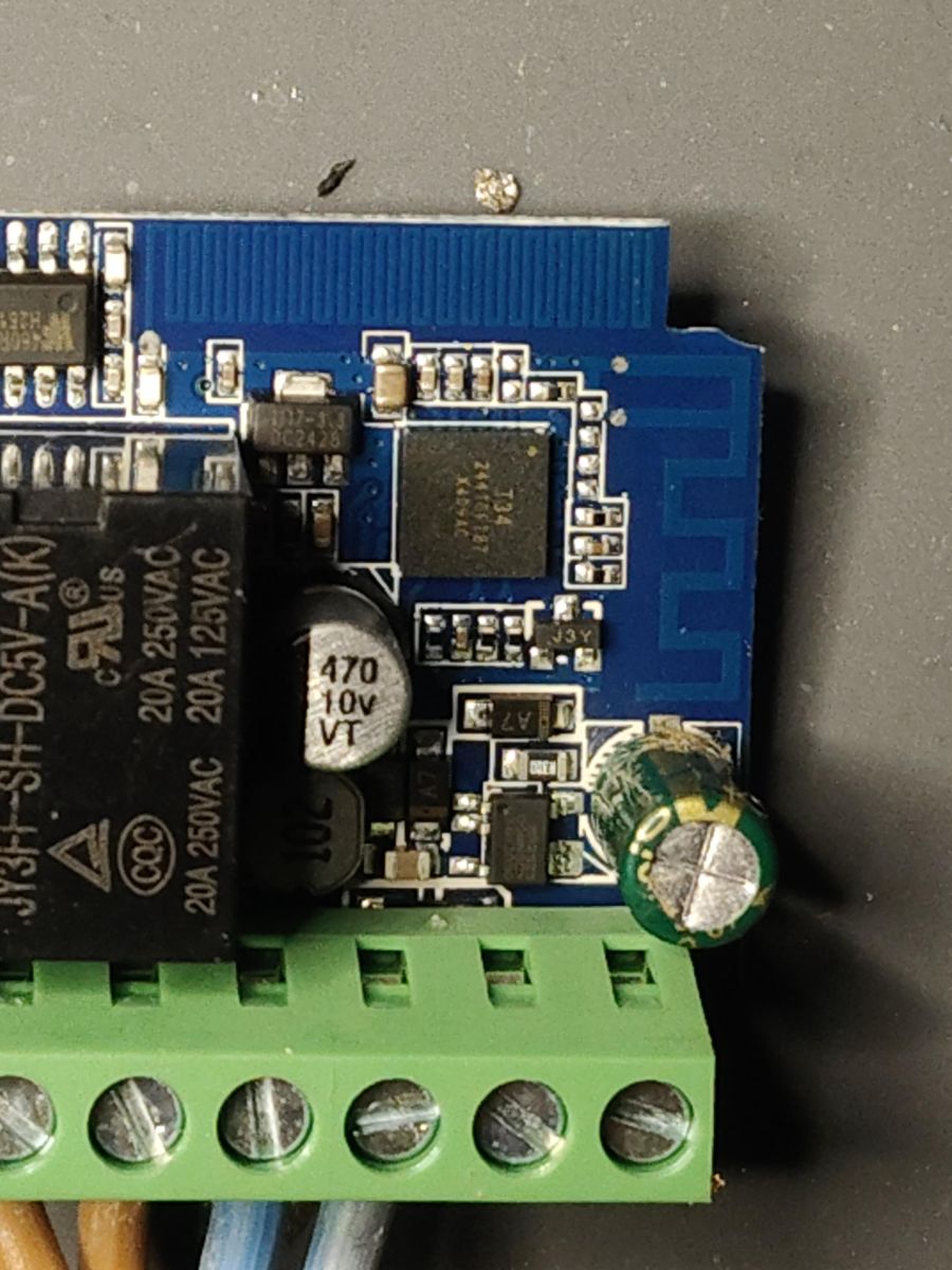 A smart switch device with Wi-Fi and RF 433. It uses a T34, but the pins are not visible. I managed to figure out the 3.3 V, GND, TX, RX pins, but I still need to figure out where the CEN is connected to boot the flash chip. Has anyone managed to flash this device where the T34 pads are not visible? I've attached some images to help you understand better.