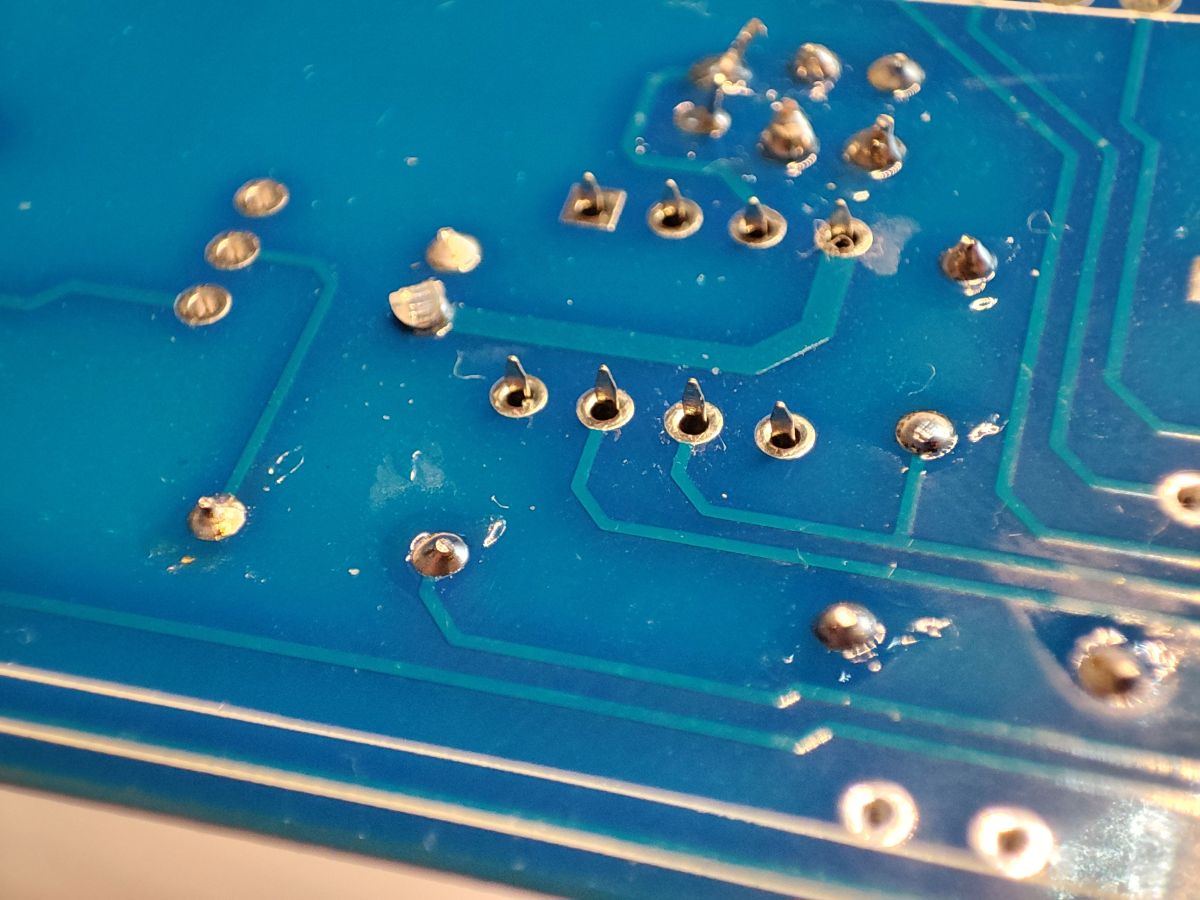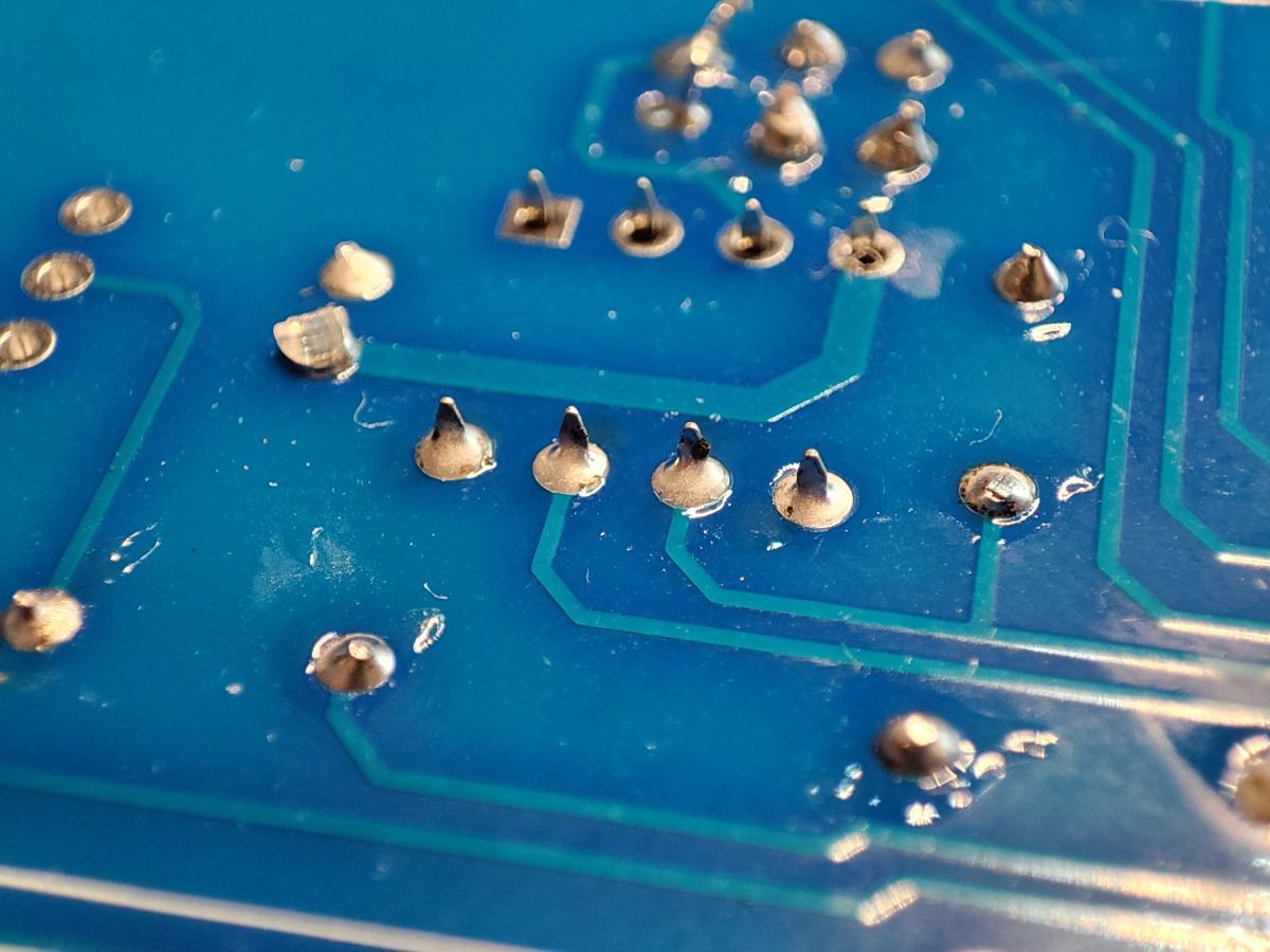Before soldering it is a good idea to clean the board with isopropyl alcohol IPA. Then solder, starting with the smallest components. Insert the component, heat up the soldering iron (but without overdoing it), you can add a little flux to make it easier, and heat up the pad, applying the solder to it. We take care of the hygiene of the soldering iron tip. We cut off the rest of the legs.
