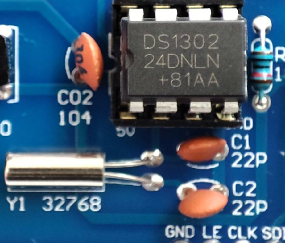 Then a 32.768 kHz quartz resonator, for precision timing, used by the DS1302 Real Time Clock (RTC) chip.