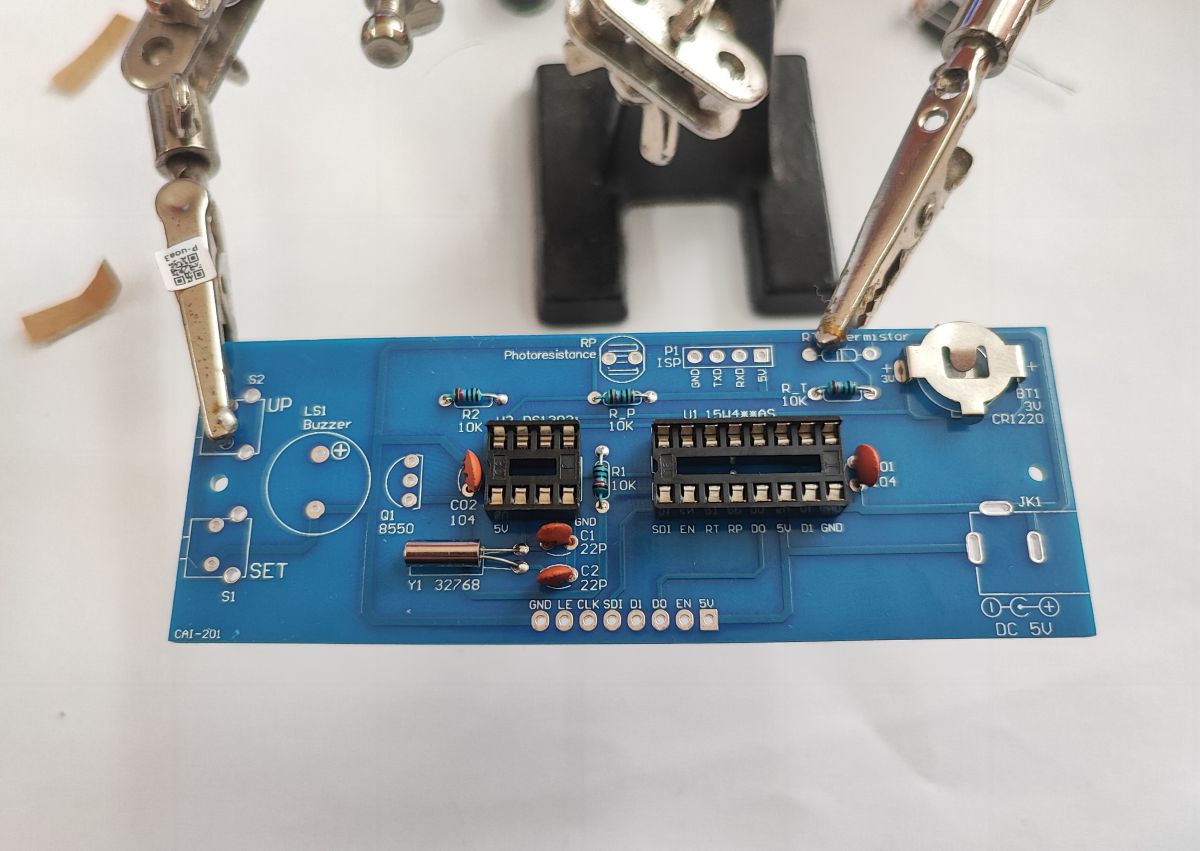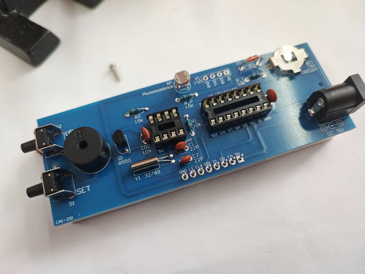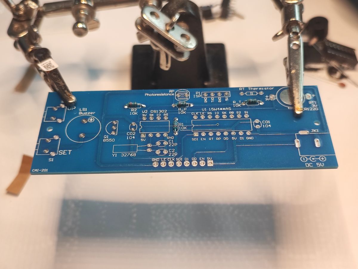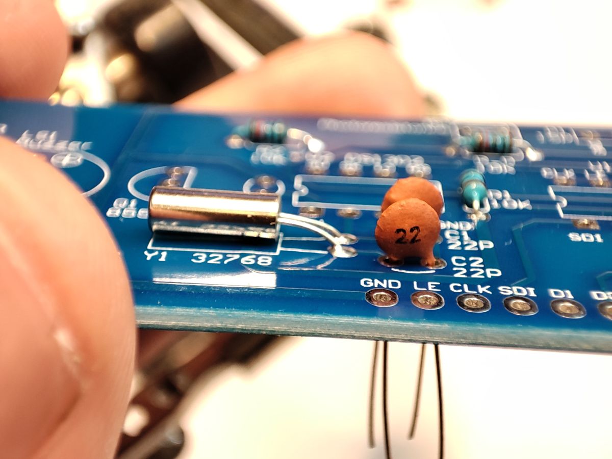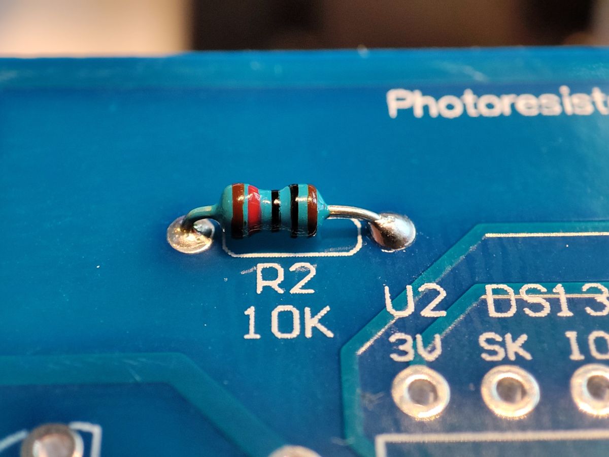 The photoresistor is used to adjust the brightness of the clock to the environment. It needs to be left long enough to dogleg it to the case later: