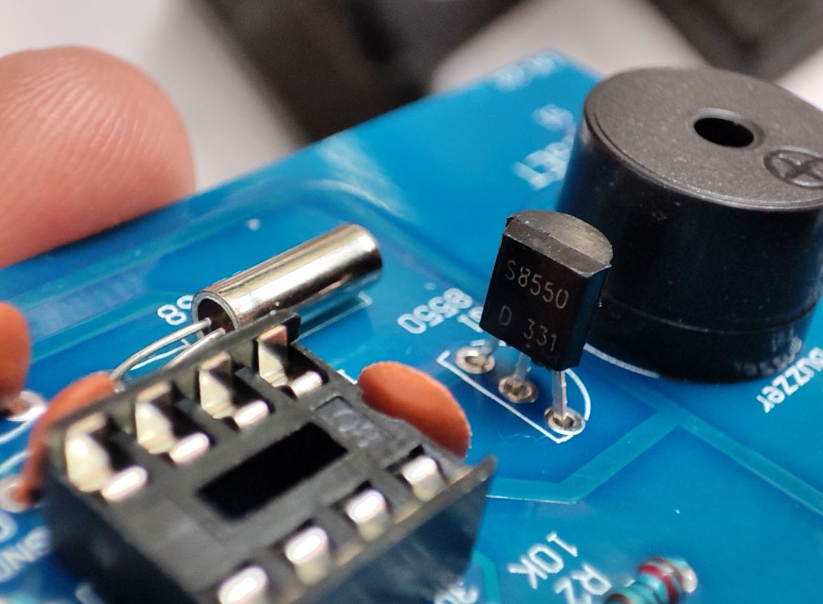 Transistor for switching on the buzzer (can't be soldered in reverse here either!):